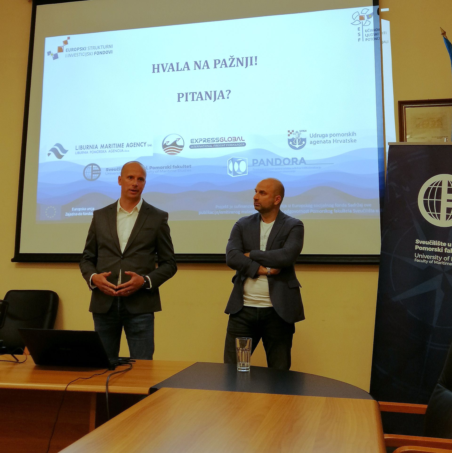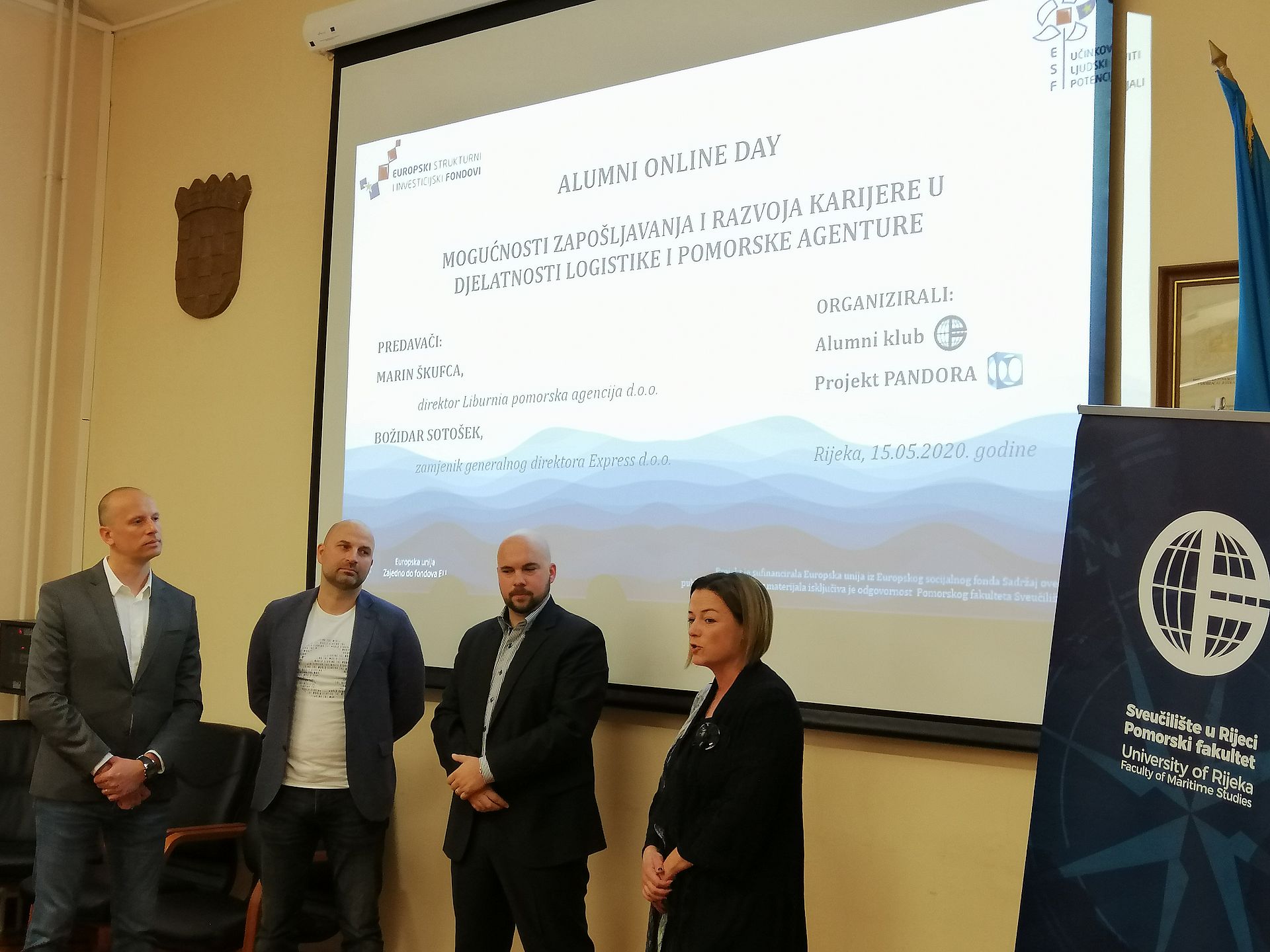 ALUMNI klub Pomorskog fakulteta u Rijeci i projekt PANDORA organizirali su 15. svibnja 2020. on-line predavanje pod naslovom Mogućnosti zapošljavanja i razvoja karijere u djelatnosti logistike i pomorske agenture. Uvaženi predavači su bili gosp. Marin Škufca, generalni direktor i suvlasnik tvrtke Liburnia Maritime Agency d.o.o. te gosp. Božidar Sotošek, zamjenik generalnog direktora tvrtke Express International Freight Forwarding d.o.o.