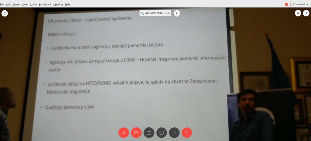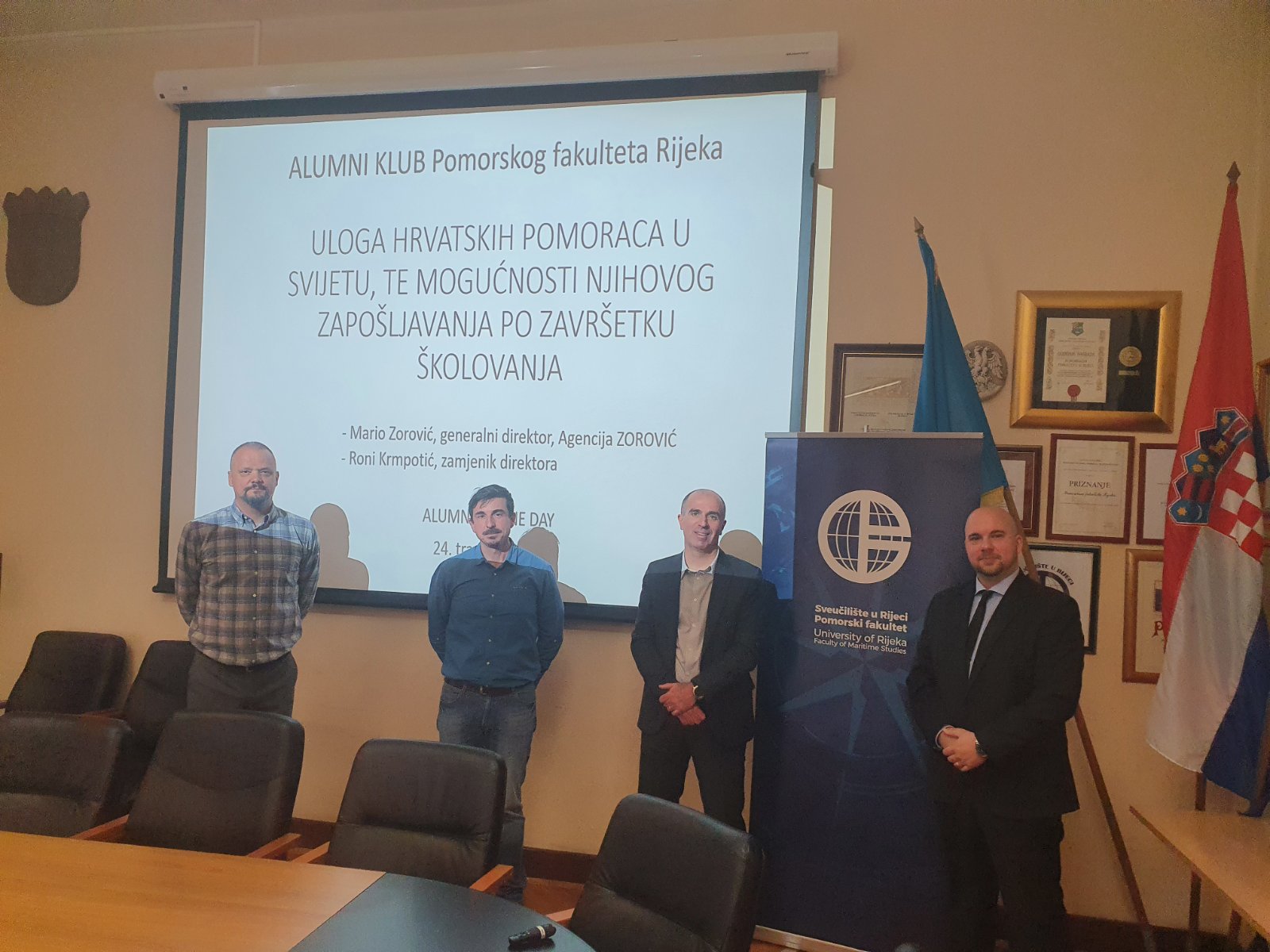 ALUMNI klub Pomorskog fakulteta u Rijeci, u želji da se zadrži kontakt sa studentima u vrijeme ostanka kod kuće i kada na Fakultetu nema predavanja i ispita, organizirao je 24. travnja 2020. on-line predavanje pod naslovom Uloga hrvatskih pomoraca u svijetu, te mogućnosti njihovog zapošljavanja po završetku pomorskog obrazovanja. Gledatelje je u predavanje uveo predsjednik ALUMNI kluba doc. dr. sc. Srđan Žuškin rekavši da je ovaj događaj upravo ono čime se Klub bavi: povezivanje studenata Pomorskog fakulteta s pomorskom privredom i praksom. Predavanje je održano u sklopu projekta MZOŠ-a PANDORA (Promicanje izvrsnosti vještina za tržište rada kroz institucionalizaciju stručne prakse u pomorskom obrazovanju).