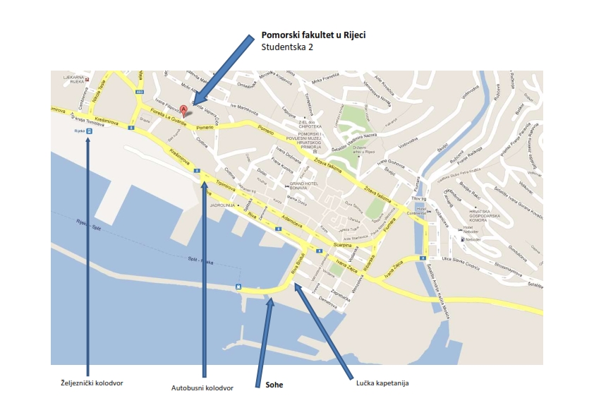 Pomorski fakultet u Rijeci nalazi se 500 m od pješačke zone u centru Rijeke. Udaljen je desetak minuta hoda od centra, isto toliko od autobusnog kolodvora, a od željezničkog kolodvora do Fakulteta potrebno je 15 minuta hoda. Ukoliko želite od Fakulteta doći do Lučke kapetanije Rijeka, šetnjom će trebati petnaestak minuta.![]()